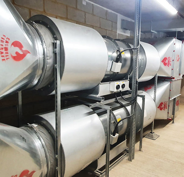 The technical specification integrated five components to deliver complete fire safety protection. Natural ventilators meeting Part 2 standards provide smoke clearance at the top levels. Extract fans complying with Part 3 requirements incorporate Danfoss FC102 frequency drives for control during emergency operations.